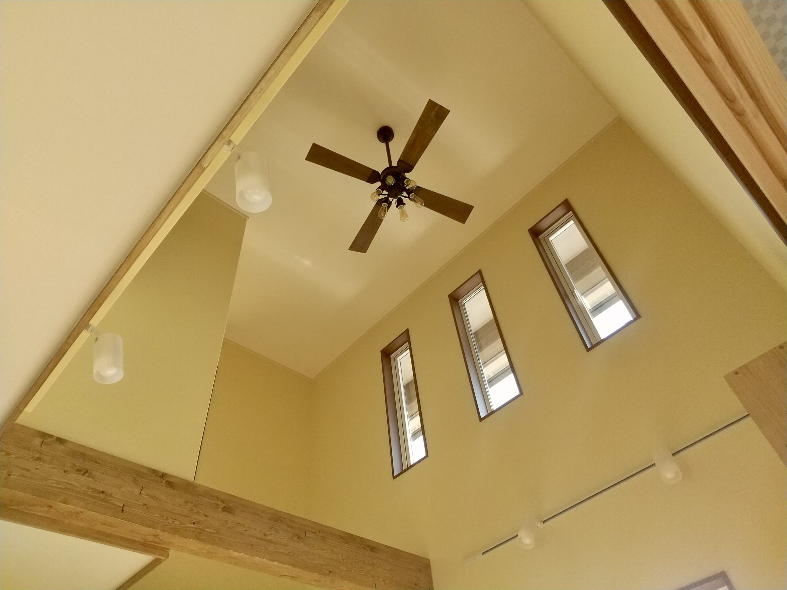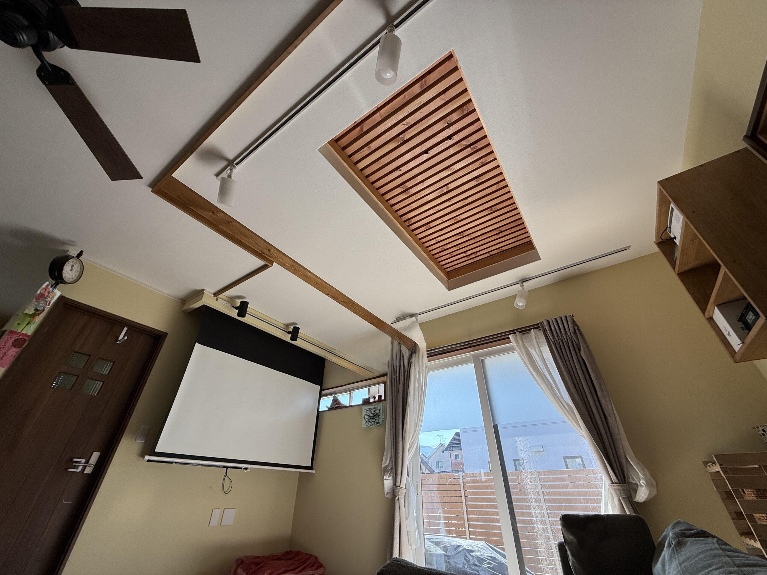 引き渡し時にあったリビングの吹き抜けは今はありません。お子さんたちが保育園へ通うようになり、お洗濯物が増えました。ベランダとランドリールームを設けましたが、干す場が手狭になり、吹き抜けを閉じて空間を作りました。格子状の部分は風を通すことができ、蓋を閉めればお部屋として使え、将来的にお子さまのお部屋にとお考えです。