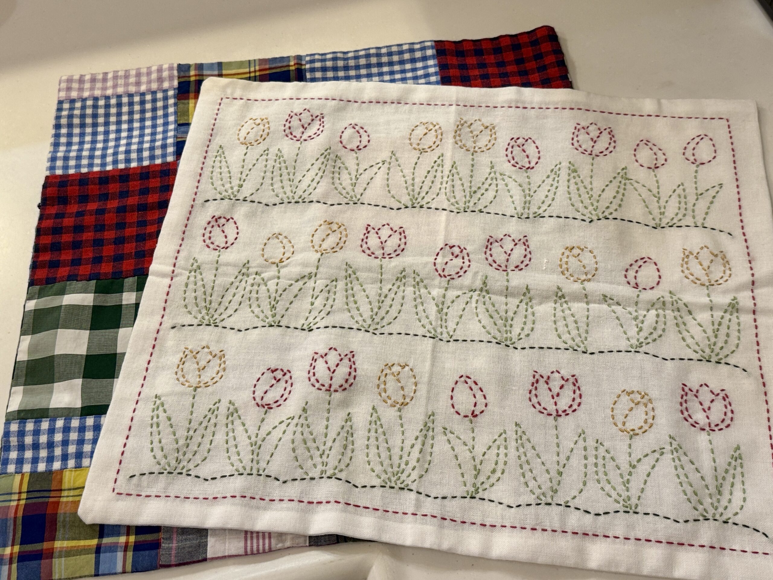 年末頃にいただいた刺し子の材料、少しづつ進めて布巾が仕上がりました。キッチンに春が咲きましたよ。端切れをつないだナフキンは〇〇専用ではなく、お弁当包みとか、キッチンツールの目隠しなどマルチに使おうと考えています。